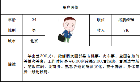 目标人群:20-30岁基层拓展人员,男性为主,高中及以上学历,基本收入在5000元以上;