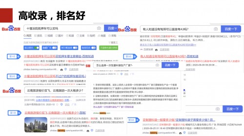 目前,百姓问答刚进行完一次大规模的升级,优化了发布流程、前端的页面结构及SEO代码。同时通过机器审核及人工审核机制,对知道内容进行严格把控。将百姓知道打造了一个快速收录排名的,高质量内容平台。仅在前期限量测试期间,商户的隔日收录率已超过50%。原创内容收录已高达80%以上,远超市面上的各类问答产品。