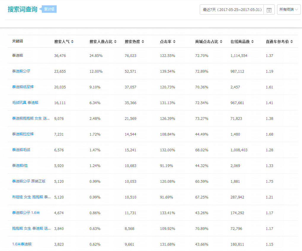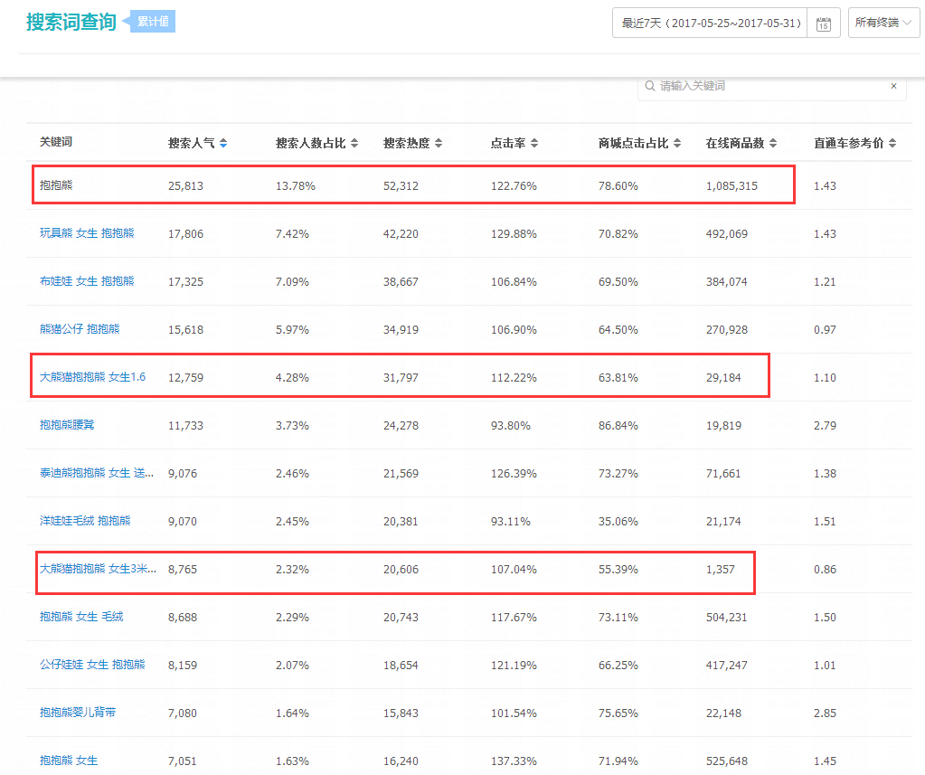 我们可以发现,大尺寸的毛绒玩具,市场上做的人少,竞争相对不激烈,你的产品也更容易获得相对优势,这样的词语是我们优先考虑选择作为作为突破口的。