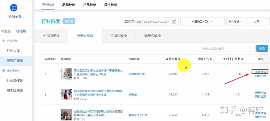 打开市场行情→商品店铺榜→行业粒度→流量商品榜→查看详情