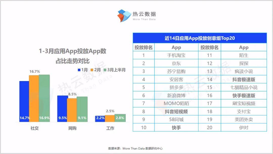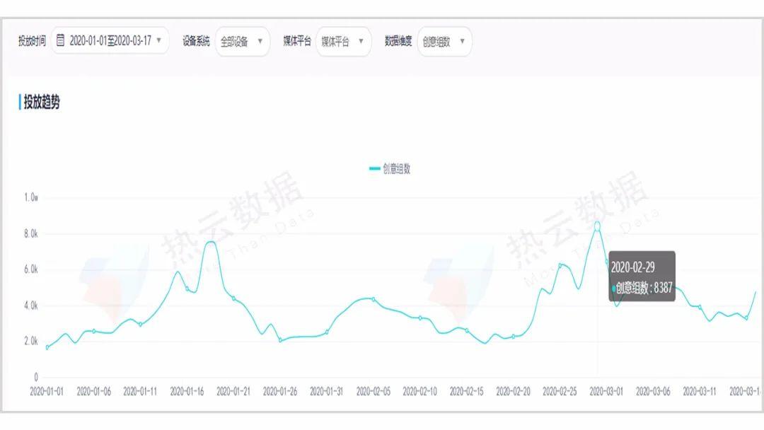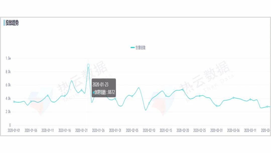 根据热云数据监测,经过了“水深火热”的2月,整体网购App行业鉴于国家相关政策、管制措施的逐渐放宽,其投放量开始稳步提升。3月份以来网购App投放数量占比已基本恢复春节前的水平,并与社交类、工作类App成为2-3月份投放产品占比提升最高的3个应用App类型。