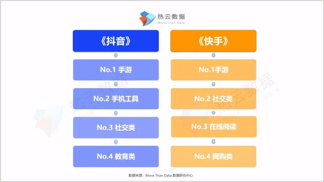 根据热云数据最近30天以抖音与快手作为投放渠道,所关联的App行业进行分布统计来看,手游行业是两款App最大的“金矿”且在抖音渠道投放手游数量占比要高于快手,可见抖音目前对于手游行业的“依赖性”仍较强。根据热云数据过往报告,由于版号等原因的手游买量行业依然“寒意凛凛”。因此,这也必定会倒逼短视频App对于新行业、新模式的创新。因此,鉴于当前以两款App为代表的移动应用已持续相当长一段时间对于下沉市场“猛”下钻,无论是从其用户画像还是金主画像上,在下沉流量红利逐渐衰退时,如何运营好自身的庞大流量或产品功能\业务方面的区隔与转型,已经显得尤为重要。