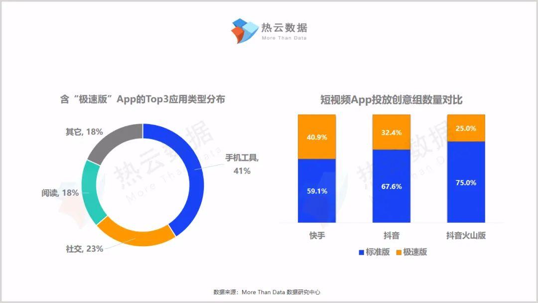 2019年,极速版已成为超级App下沉快速拉新的“必备品”。除手机工具外,社交App行中的“极速版”App数量最多。根据其投放创意组数量占比看,《快手》、《抖音》以及《抖音火山版》(原《火山小视频》)三款极速版的投放占比最高且至少占到自身总体(标准版+极速版)投放量的四分之一。由此可见,极速版的推出绝不仅仅是基于自身产品功能体验上的简单补充,而是其进行买量与获客的重要一环。