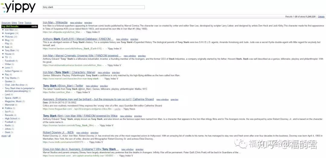 Yippy是一个集成化搜索引擎,它将多个搜索引擎信息结合在一起,然后得出统计结果。同样,Yippy还是一个不错的暗网信息检索工具。暗网因其存储在专用网络而被屏蔽难以发现,而Yippy提供的搜索结果将帮助你发现不被传统搜索引擎检索到的隐藏网站。