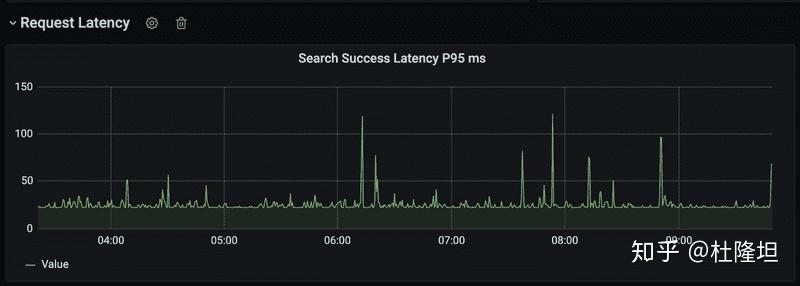 在下图展示的 Grafana 仪表盘中,我们看到除了几个时不时的慢查询,搜索的 95% 服务器处理延迟小于 20 毫秒。对比同样的数据集上 benchmark 的 Elastic Search 引擎的 P95 搜索延迟则在 200 毫秒左右,所以排除了引擎速度慢的可能。