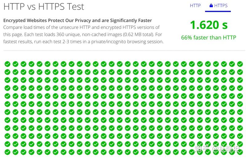 如果你想自己看一下 HTTP 1.1 和 HTTP 2.0 的速度差异,可以试一下:https://www.httpvshttps.com/。我的网络测试下来 HTTP/2 比 HTTP 1.1 快了 66%。