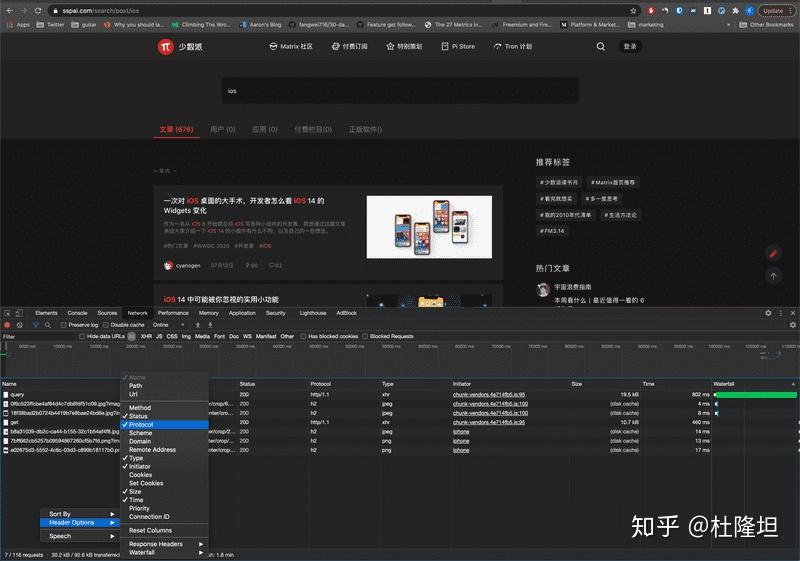 在 Chrome 中打开开发者工具,点开 Protocol 之后在所有的请求中都可以看到请求用的协议了。如果 protocol 这列的值是 h2 的话,那么用的就是 HTTP 2 了