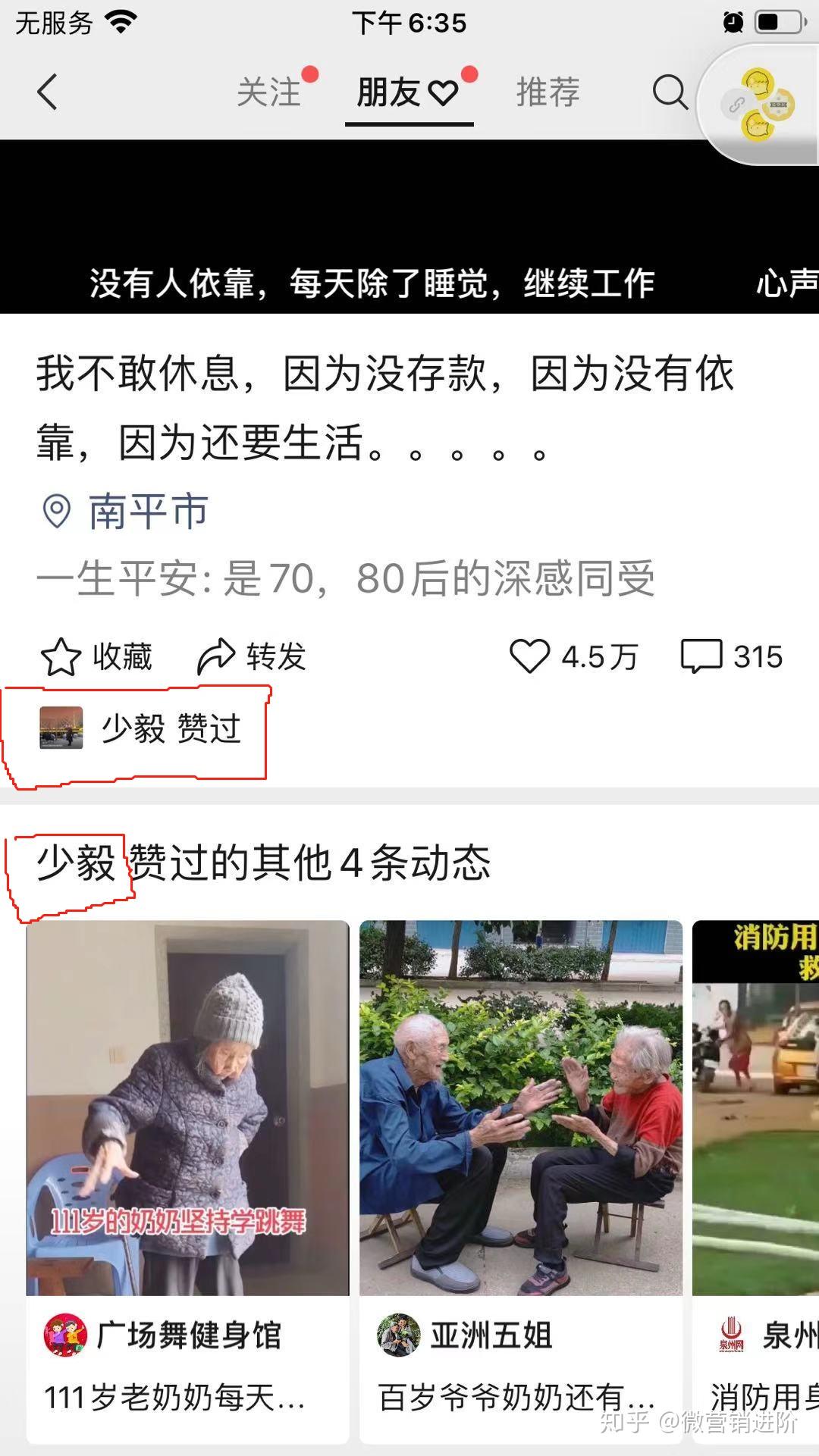 此外,用户点赞的其他视频也会被曝光。当你刷【朋友】栏目时,刷着刷着就会刷到该好友点赞视频下方会有一栏可左右滑动的视频推荐栏目,推荐他之前点赞的视频,如下图所示: