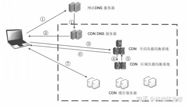 ⑦用户向缓存服务器发起请求,缓存服务器响应用户请求,将用户所需内容传送到用户终端。如果这台缓存服务器上并没有用户想要的内容,而区域均衡设备依然将它分配给了用户,那么这台服务器就要向它的上一级缓存服务器请求内容,直至追溯到网站的源服务器将内容拉到本地。