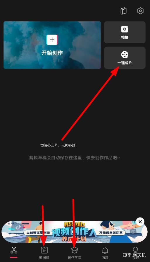 以剪映为例,点击“一键成片”,上传几张图片,选个模板,几秒钟就能搞定一个视频。