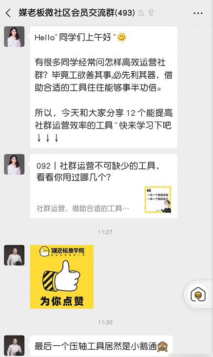 让群里一些比较高活跃的用户,在群里定时分享一些工作上的经验和内容,这样在提高社群活跃度的时候也能培养出一批群内的意见领袖。