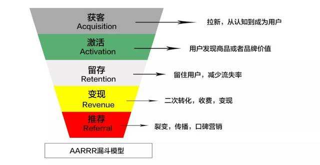获取用户(Acquisition)→提高活跃度(Activation)→提高留存率(Retention)→获取收入(Revenue)→用户自传播(Refer)