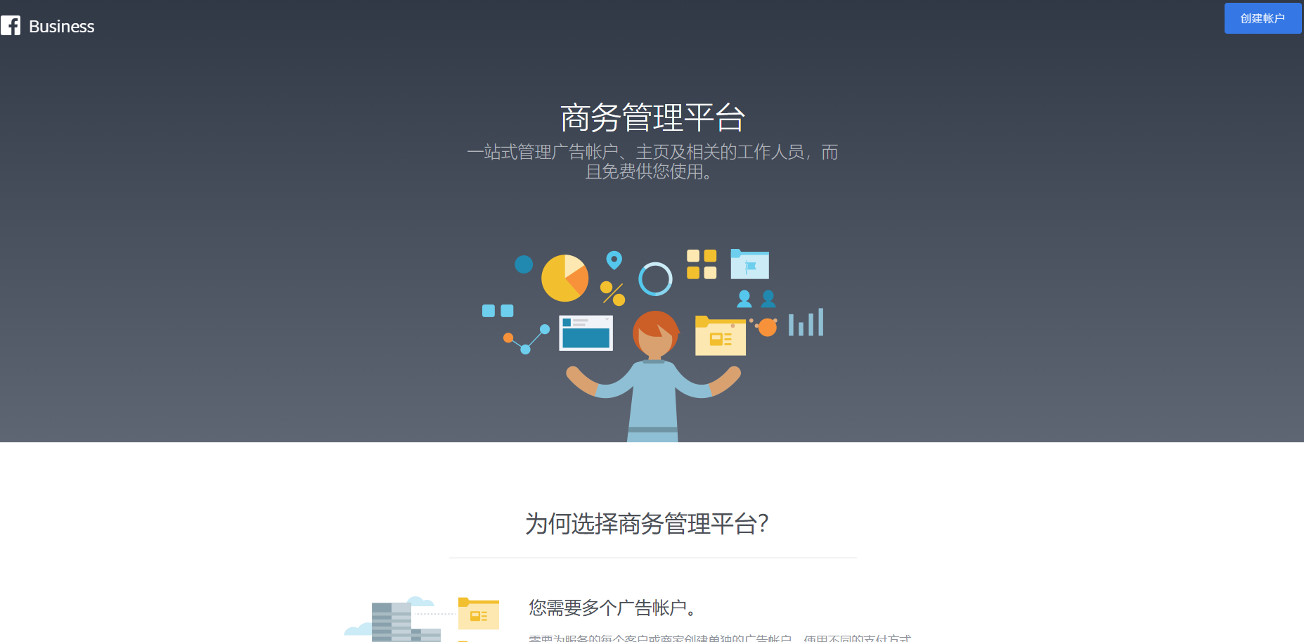 梳理清楚个人账号与公共主页,我们会到广告部分。广告部分实际上是有个人操作账户和所谓的企业账户,即要求你验明企业身份的那种。 很多人在这里就会有一种误解,就是个人操作账户是个人都可以操作,那么企业账户是不是只能找代理开户呢?答案是:否。 Facebook官方从来没有说明企业账户只能找代理开户,也就是说个人也是可以开户的。实际上,Facebook官方是有说明如何开通商务管理平台的,操作步骤如下: