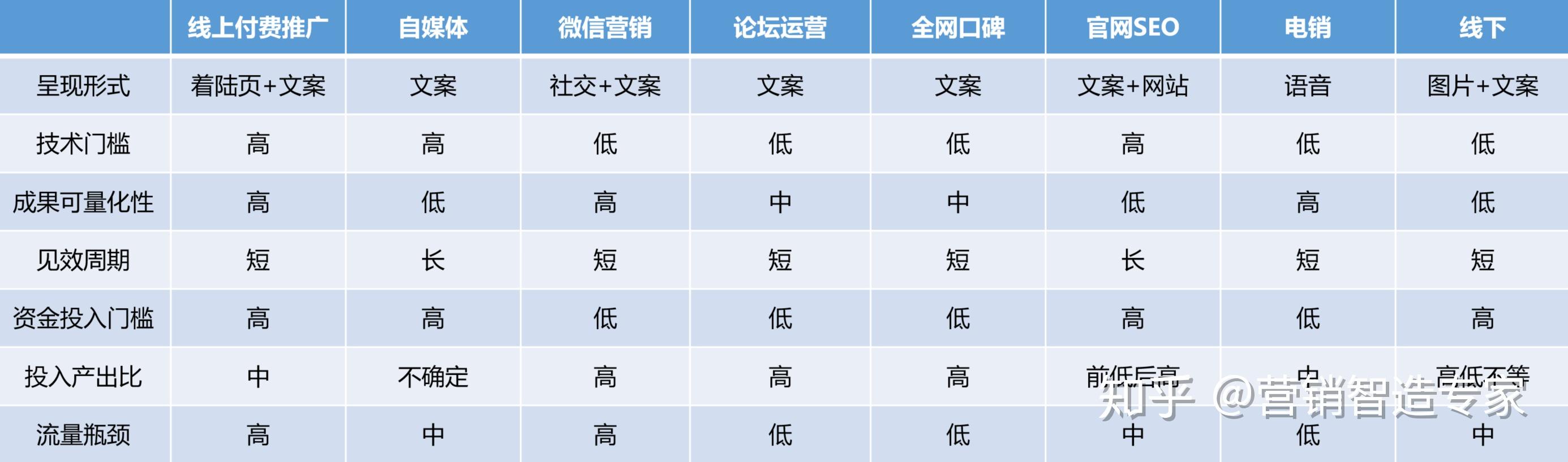 我觉得主要可以从这么几个维度去分析:呈现形式、技术门槛、成果可量化性、见效周期、资金投入门槛、投入产出比、流量瓶颈。