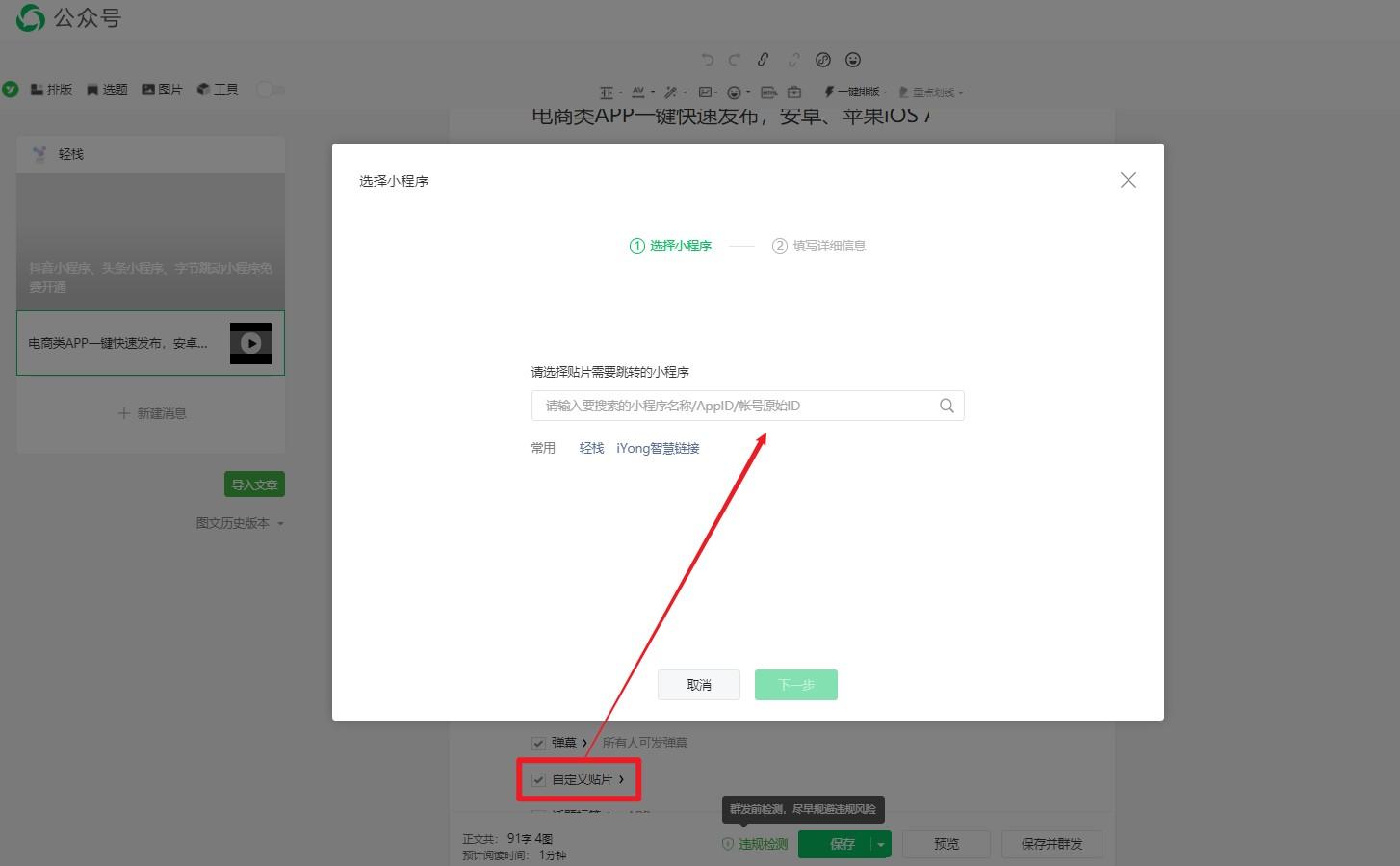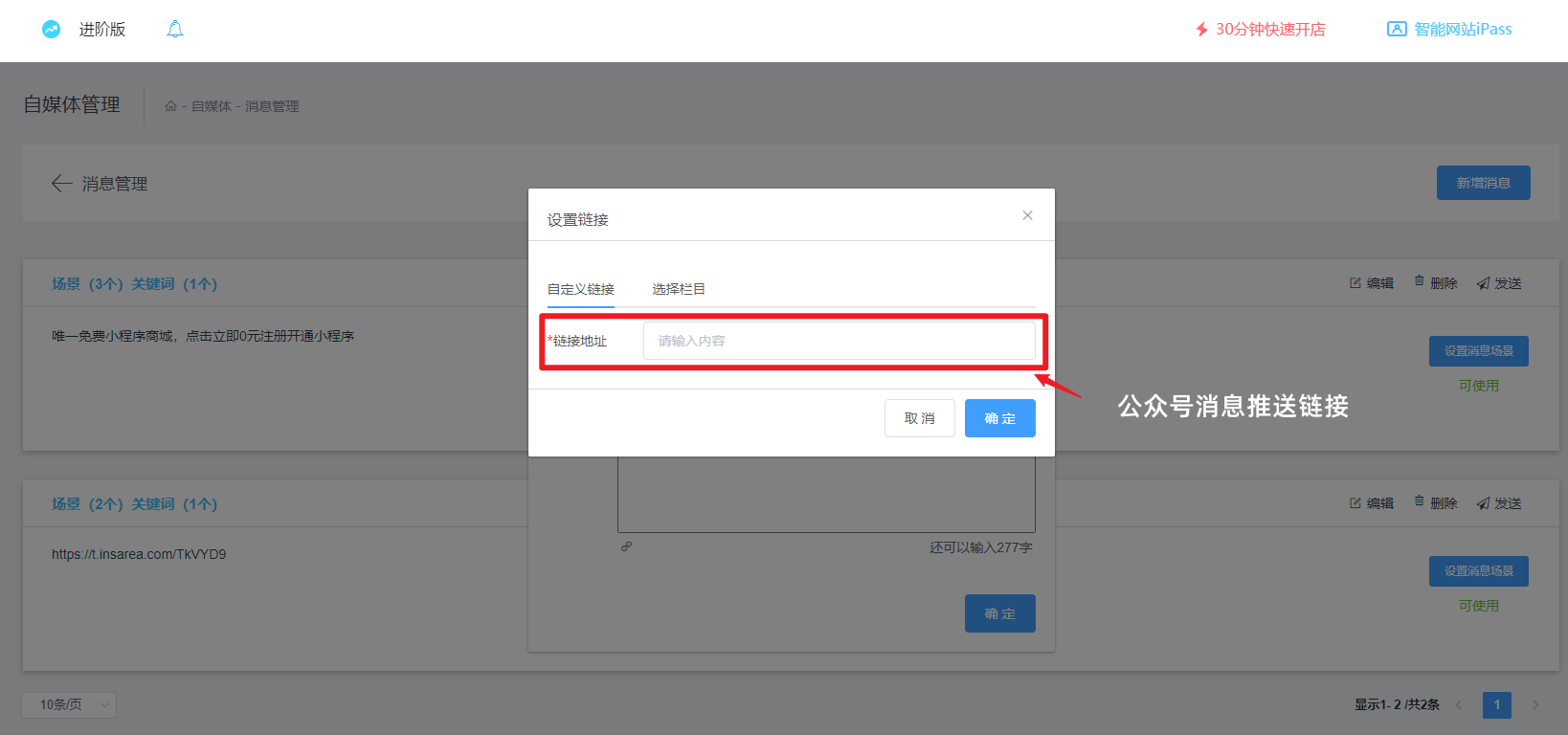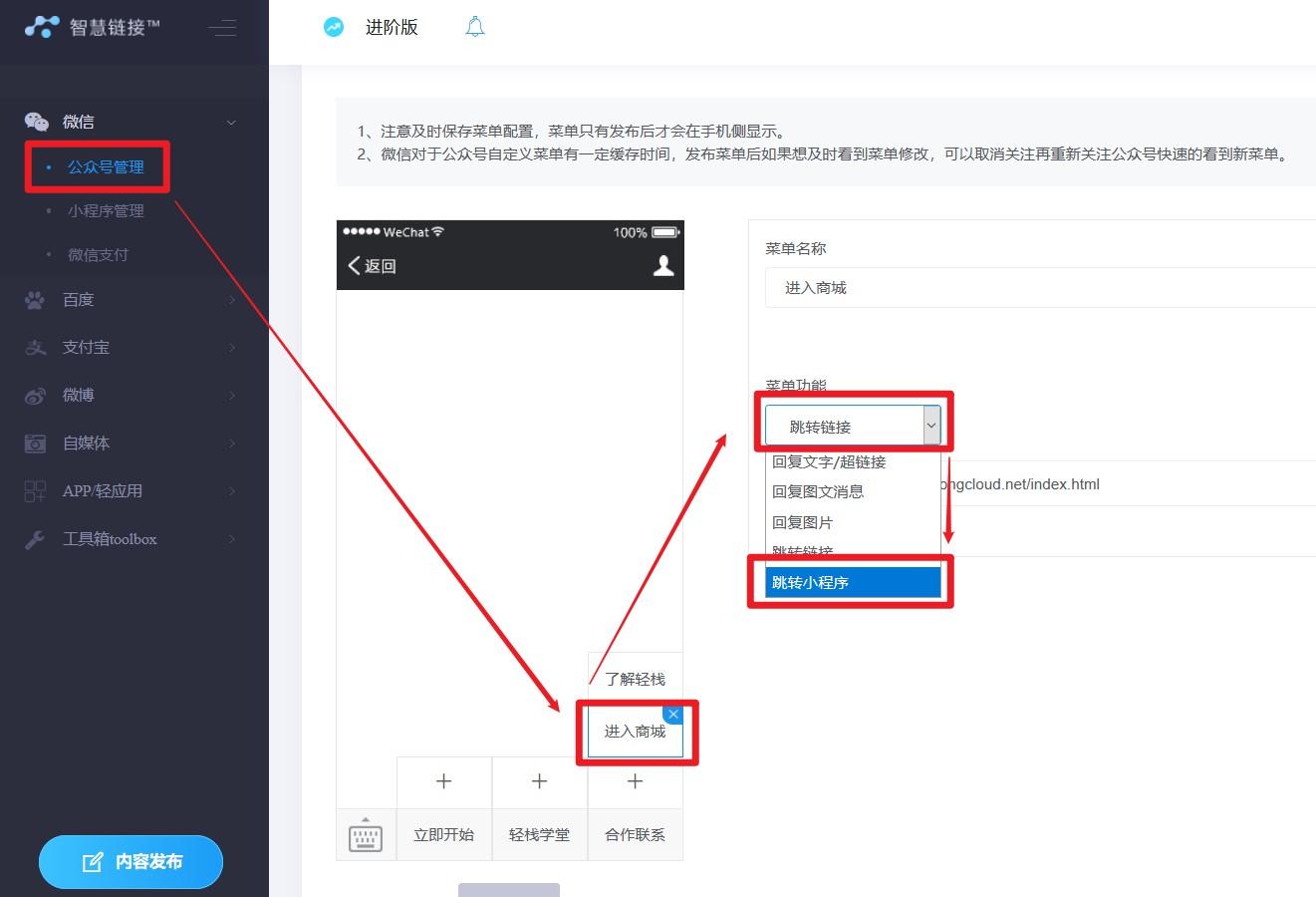 1.扫码授权公众号到智慧链接,进行自定义菜单设置,输入菜单名称,菜单功能选择跳转小程序。