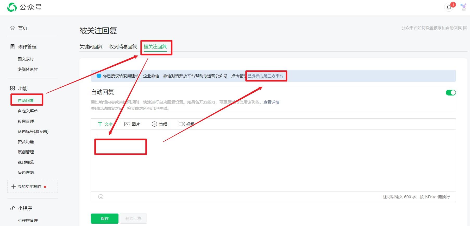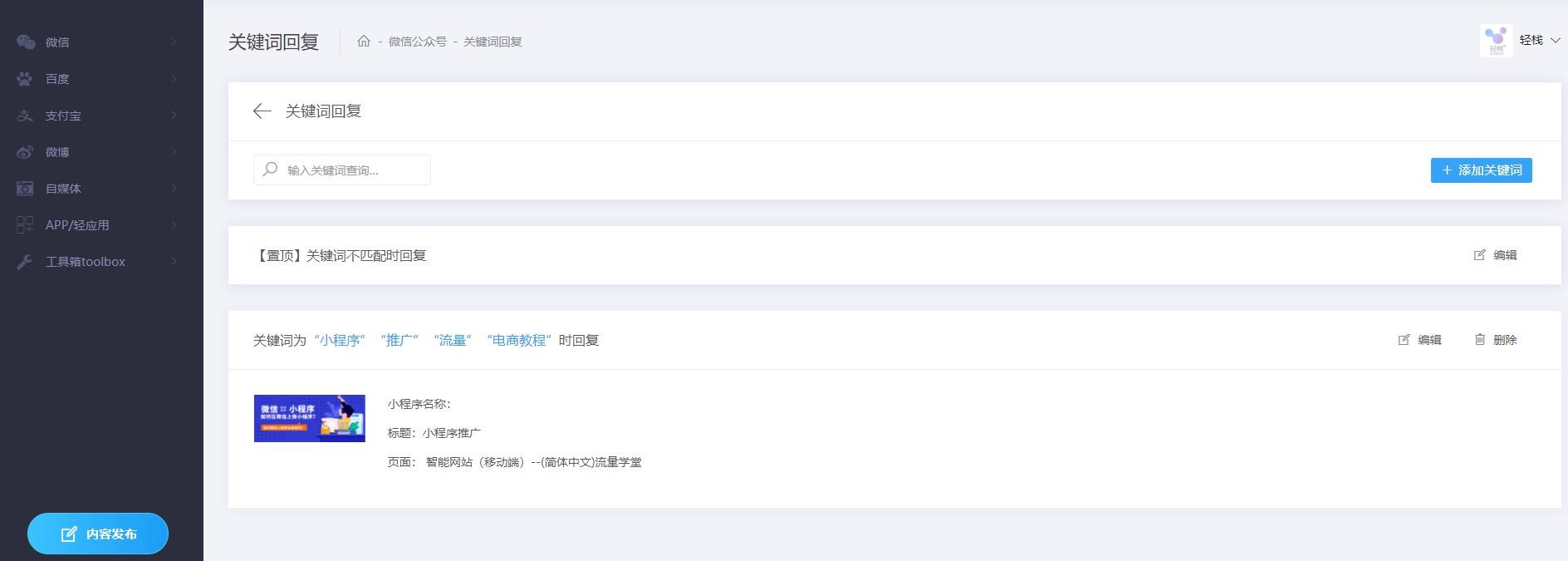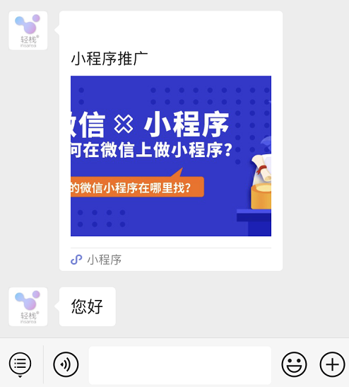 你也可以选择把公众号授权到第三方,比如轻栈,完成相关操作。进行灵活设置,比如用户关注之后,在感谢关注语之后, 添加最新福利,简单的产品介绍配合弹出卡片式小程序商城。