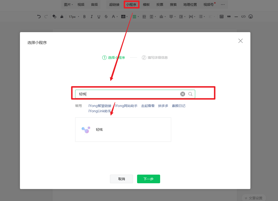 如果直接在官方后台操作,可以找一个相关功能插件安装,才能设置跳转小程序。