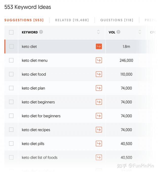 用户输入关键词,UberSuggest可立即展示所有与之相关的长尾词,以及每个关键词和长尾的每月搜索量,平均每次点击费用,PPC竞争和SEO竞争。