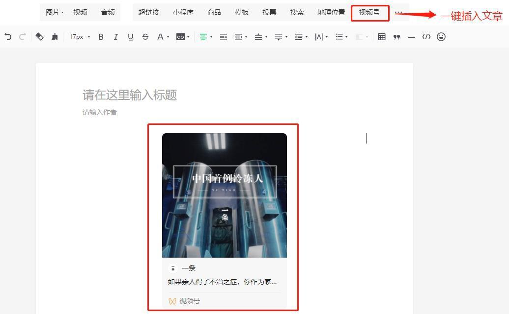 微信公众号编辑页面可直接插入视频号内容,最多可插入 10 条不同视频号的内容,实现公众号与视频号互动、引流等。