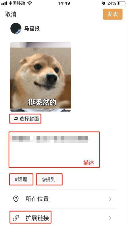 当前,短视频功能下,除基本剪辑功能外,有添加话题、@其他视频号、位置标记、扩展链接 4 个主要功能,支持选择封面,扩展链接当前仅支持公众号文章链接。