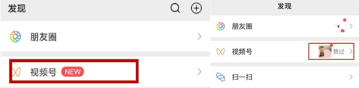 视频号有热门内容更新时,“视频号”位置有头像、朋友点赞、NEW 等多种形式提醒, 权重不低于朋友圈提醒。