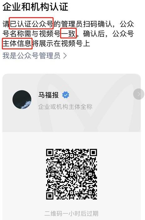 认证流程:视频号认证→企业和机构认证→已认证公众号管理员扫码确认→认证审核。