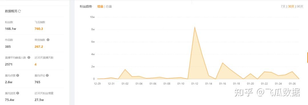 “千雅折一湖”目前粉丝168.1w,发布了385个作品,近30天粉丝增量27.5w,其中1月12日当天就涨了8.4万个粉丝。