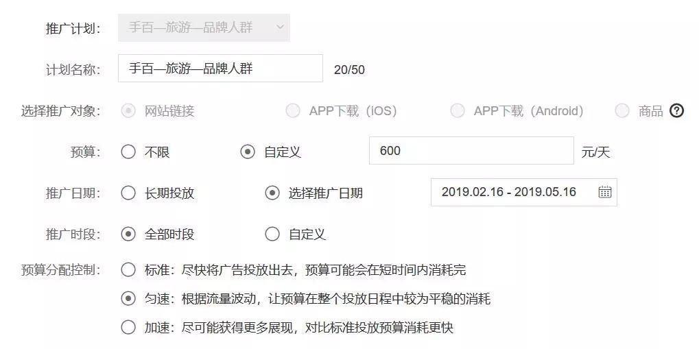 3.来到计划的创建页面,制定计划名称,然后再设置推广对象、引流的类型,根据自己的情况选择广告展示位置,像百度首页、百度贴吧和百度浏览器这些都可以选择,然后记得设置每天的投放预算、日期和推广时段。