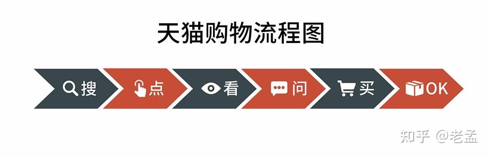 我们一起梳理一下在天猫购物的整个流程:搜索商品>点击商品>查看商品>对比商品(咨询客服)>下单付款>完成交易。