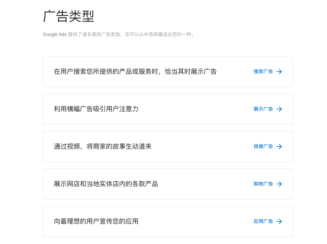 另外,Google Ads给广告主提供了多种不同的在线广告形式,如搜索广告、购物广告、展示广告、视频广告及应用广告,用户可以根据自己的实际情况选择其中的一种或多种。这几种不同类型的广告让用户在选择上具有多元化,也让企业在广告推广方面更具个性化,提高跨境电商企业的软实力与核心竞争力,获得更大的商机。