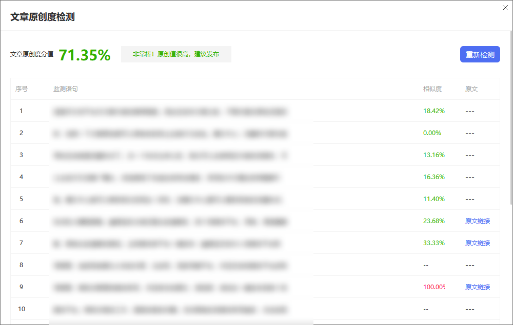 文章原创度检测:老的自媒体人都知道,现在各个自媒体平台抓文章质量抓得很厉害,一旦非原创的内容被举报或者被平台抽查出来,对该账号今后的发展都是十分不利的,会影响账号的信誉评分和平台对文章内容的推荐程度。因此在发布文章之前,不管你是伪原创还是怎样,检测一下文章原创度可以很有效的防止此类行为发生。