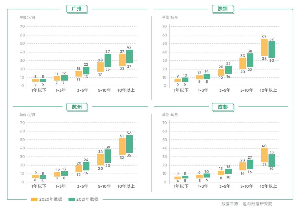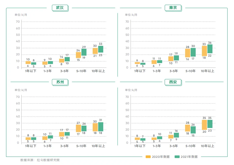 (如图3)除西安外,其他城市3-5年及5-10年经验的运营岗位薪酬涨幅相对明显,中高端岗位的薪酬涨幅拉升了整体薪酬涨幅。