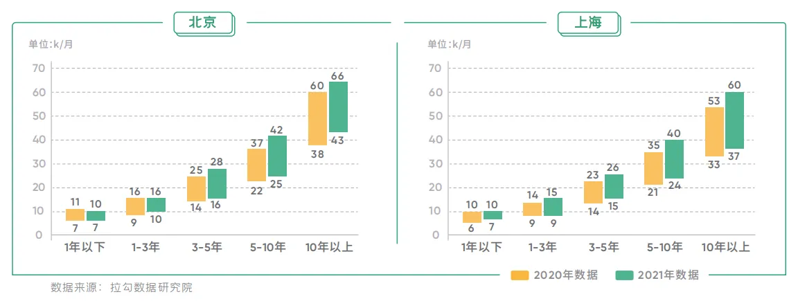 一线城市中(如图1),北京、上海3年以上经验的运营类岗位薪酬有10%左右的提升,相对较平缓;广州5-10年的岗位薪酬(如图2)有明显的上涨。