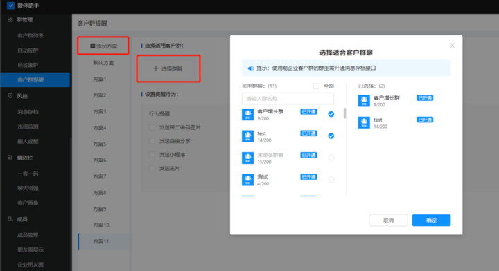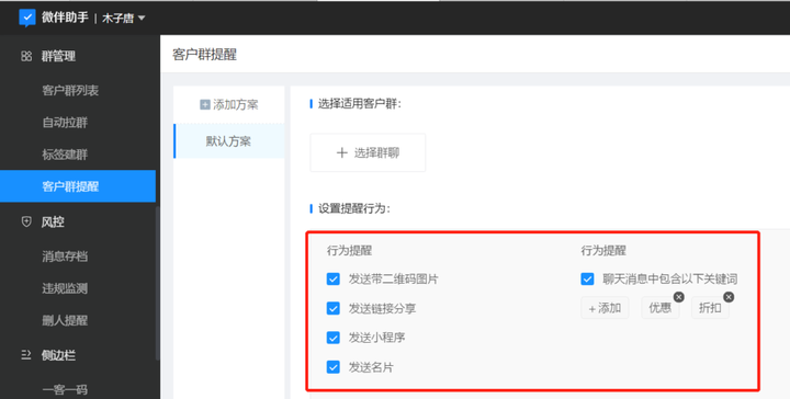 这个功能用起来也不麻烦,开通好微伴助手后,去后台选择客户群聊,选择群提醒方案就可以了,你也可以按实际情况,自行添加提醒方案。