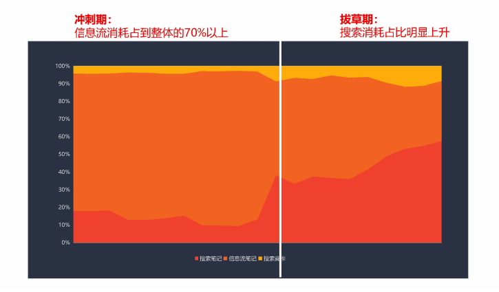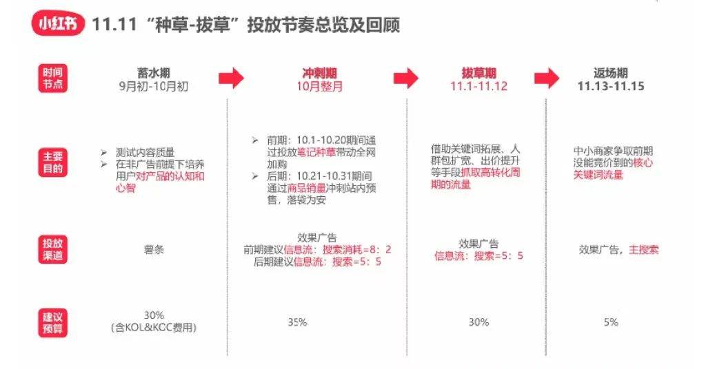 小红书种草投放,按照时间节点划分为四个时期,分别为:蓄水期,冲刺期,拔草期,返场期。