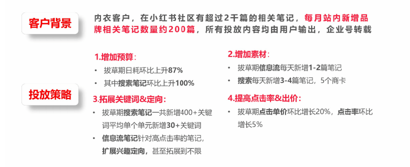 客户背景:内衣客户,在小红书社区都超过2000篇的相关笔记,每月站内新增品牌相关笔记数量约200篇,所有投放内容均由用户输出,企业号转载。