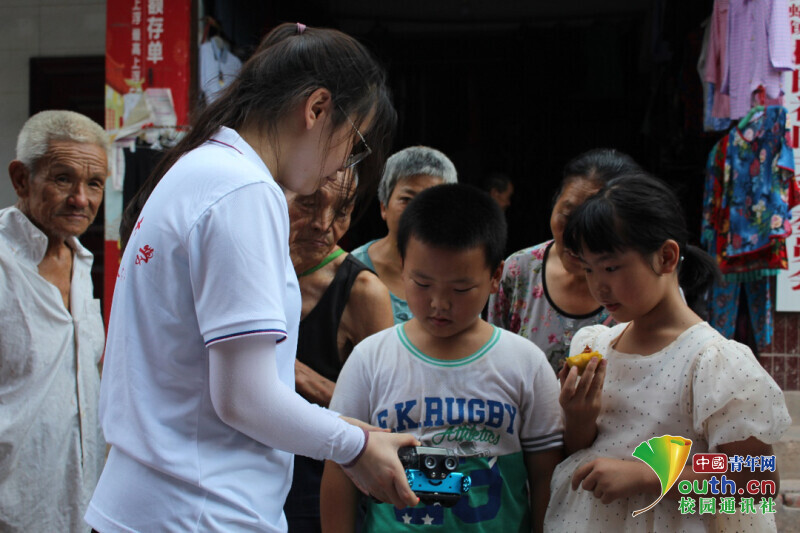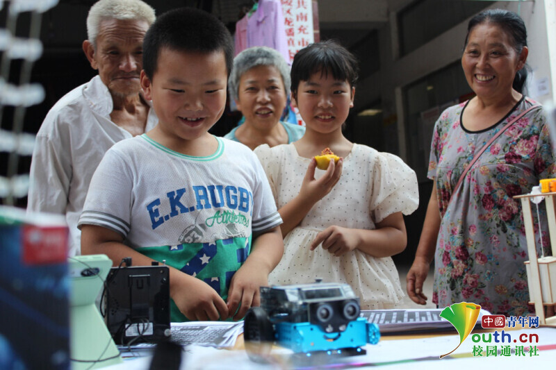 图为团队队员向小孩科普智能小车。中国青年网通讯员 王乐平 摄