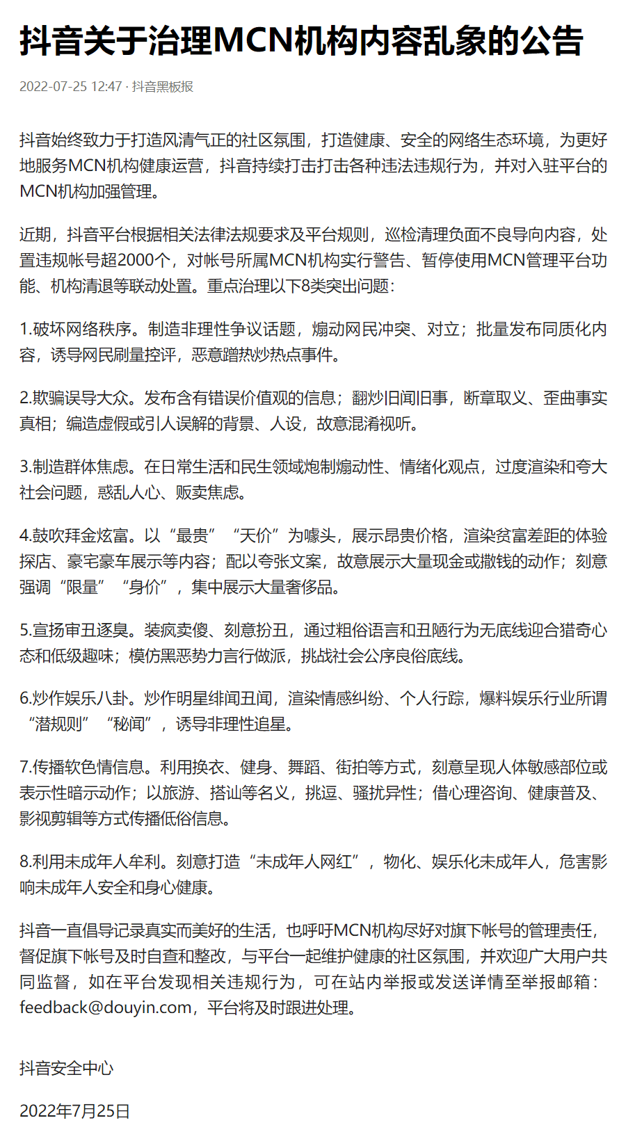 7 月 25 日,抖音发布关于治理 MCN 机构内容乱象的公告,称近期抖音平台根据相关法律法规要求及平台规则,巡检清理负面不良导向内容,处置违规账号超 2000 个,对账号所属 MCN 机构实行警告、暂停使用 MCN 管理平台功能、机构清退等联动处置。重点治理鼓吹拜金炫富、传播软色情信息、利用未成年人牟利等 8 类突出问题。