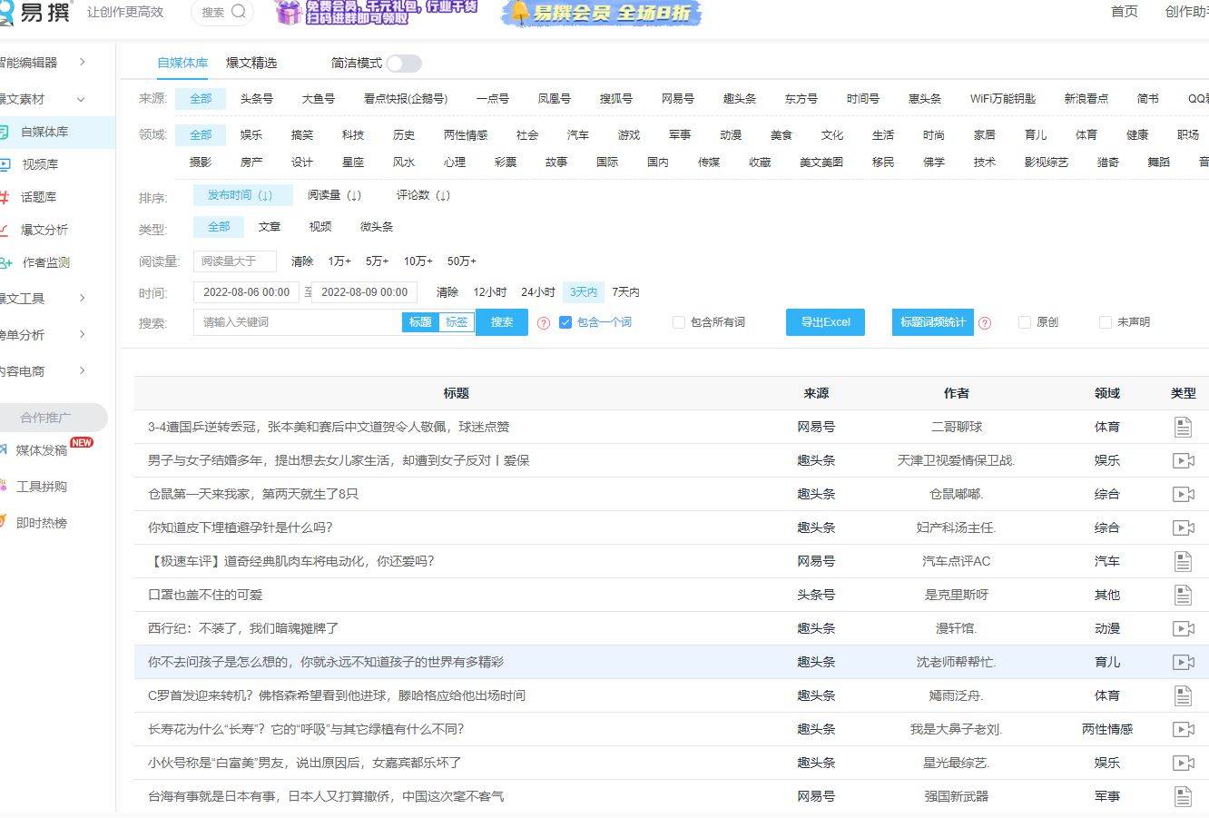 自媒体大神无论是找选题、创作还是发布运营都不是手动完成的,通常都是借用工具,找素材、选题、热点可以使用易撰内容创作神器,他的自媒体库、话题库、视频库聚合了网络素材和热点,让选题查找更轻松!