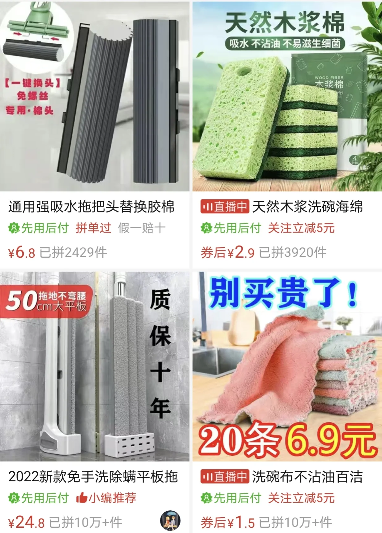家里用的扫把,拖把,抹布,卷纸,又便宜又好用,这些消耗品用完就会扔掉,真的没有必要去超市买好几十块钱一个的,这里商品在拼夕夕上销量很好。