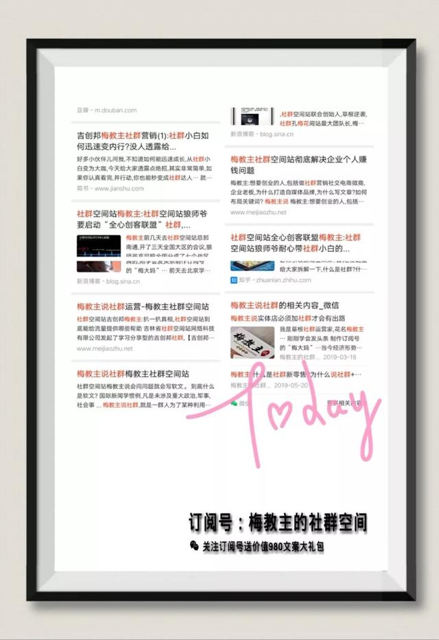 (就是题目加上“梅教主说社群”关键词写的文章,排名在前边的意思,排在前边才容易找到你,见上图)