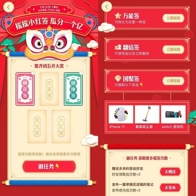 近日,小红书上线“摇摇小红签”活动,用户可收集健康、事业、桃花等5种签,集齐即可合成万事如意红包,瓜分一个亿的现金红包。